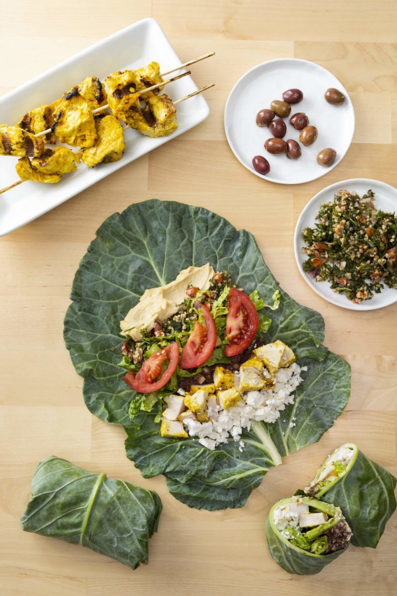 Turkey Collard Green Wraps swap out the pita for a collard green wrap. Wrapping your sandwich in a collard green leaf is another way to pack even more essential nutrients into your midday meal! This recipe uses grilled turkey kebabs, but you can sub in any cooked turkey of your choice. Fill the wrap with hummus and other Middle Eastern flavors for a healthy, handheld meal on the go.