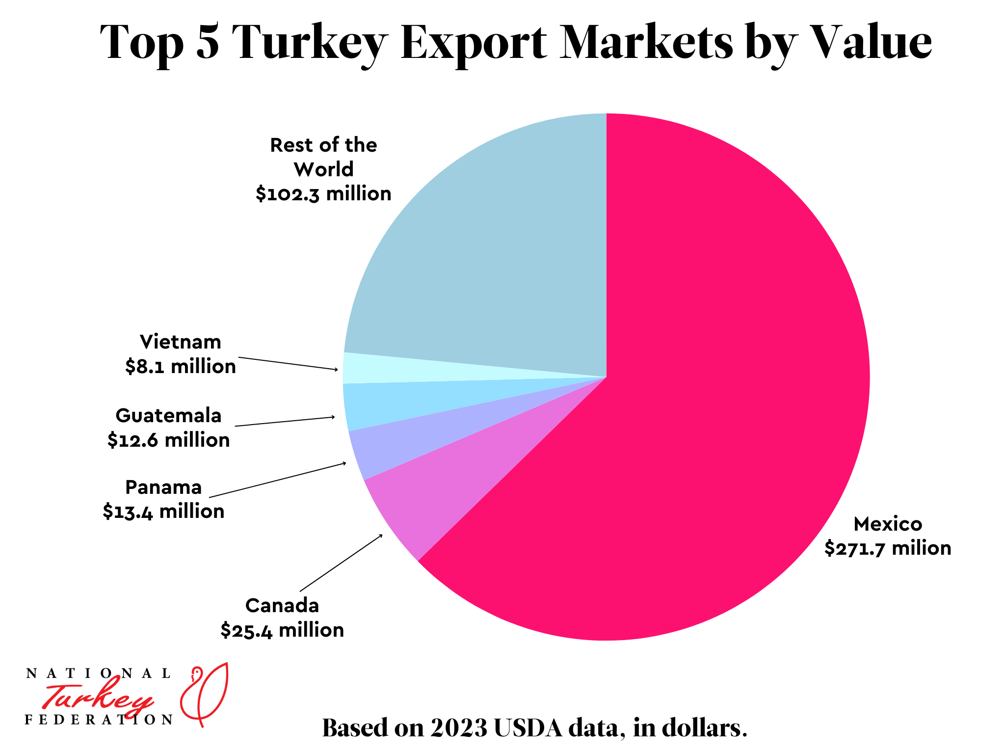 The U.S. turkey industry currently exports more than 10 percent of its products, and trade remains a market segment with growth potential for the industry. In 2023, 490 million pounds of U.S. turkey was exported.