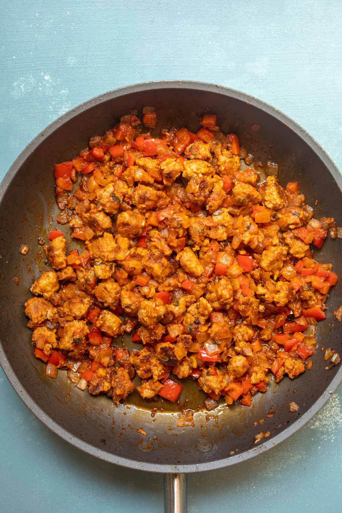 Once sausage is cooked, add peppers and onions and continue to cook for another 3-4 minutes until vegetables soften.