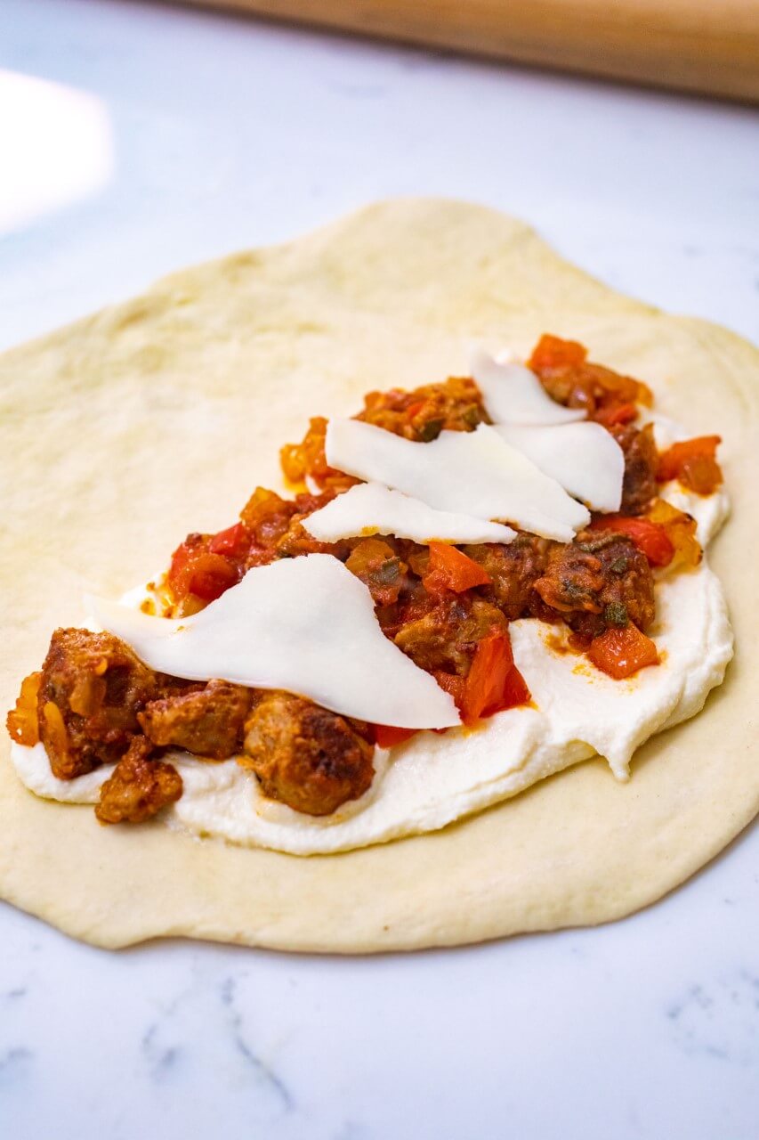 Preheat oven to 375˚F. Working with one portion of calzone dough (1/6 of batch), roll it out on lightly floured surface into a circle at least 6 inches in diameter. Add about 1/4 cup of ricotta mixture to the bottom half of dough and top with a sixth of the turkey mixture. Top that with a slice of provolone cheese, ripped up.