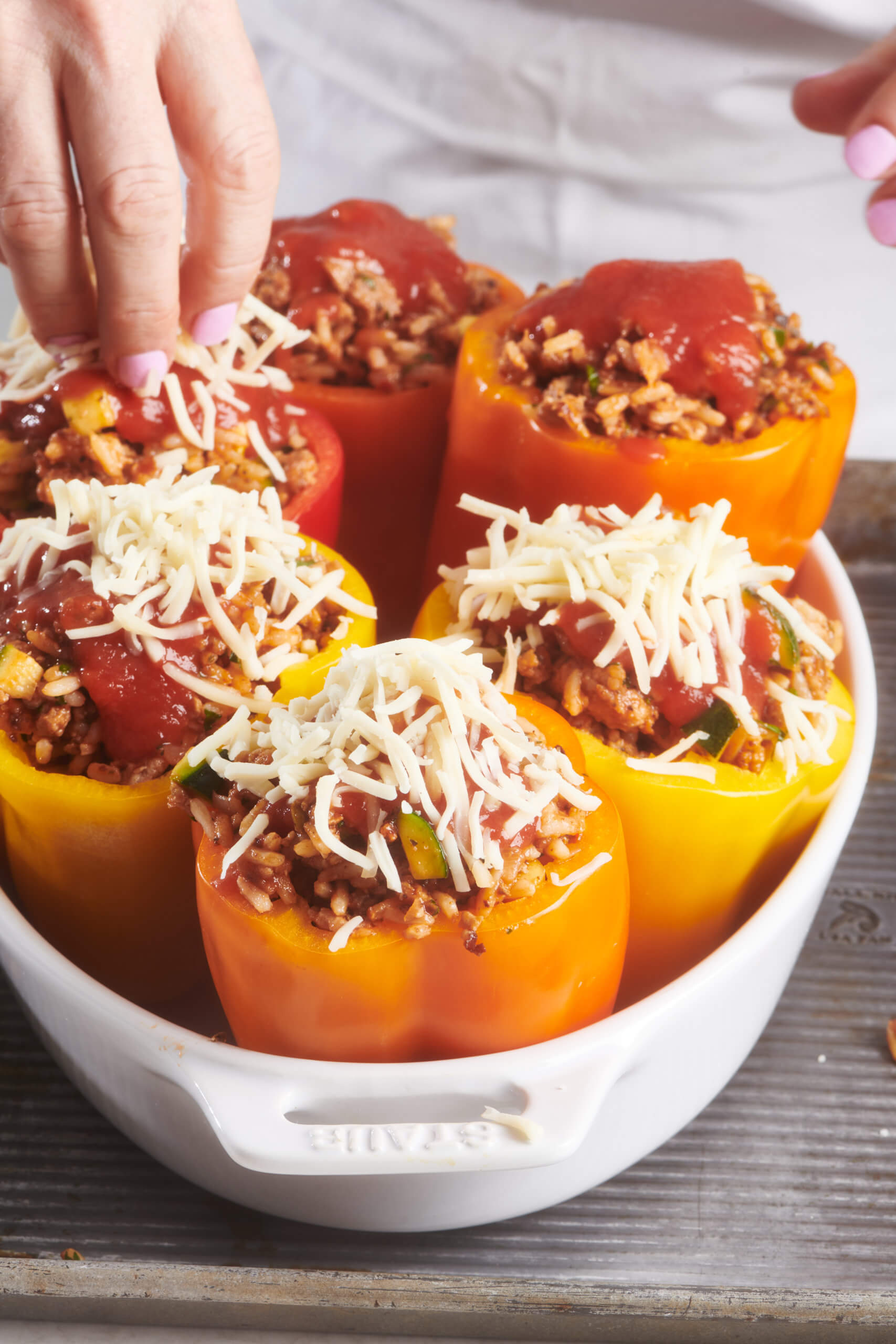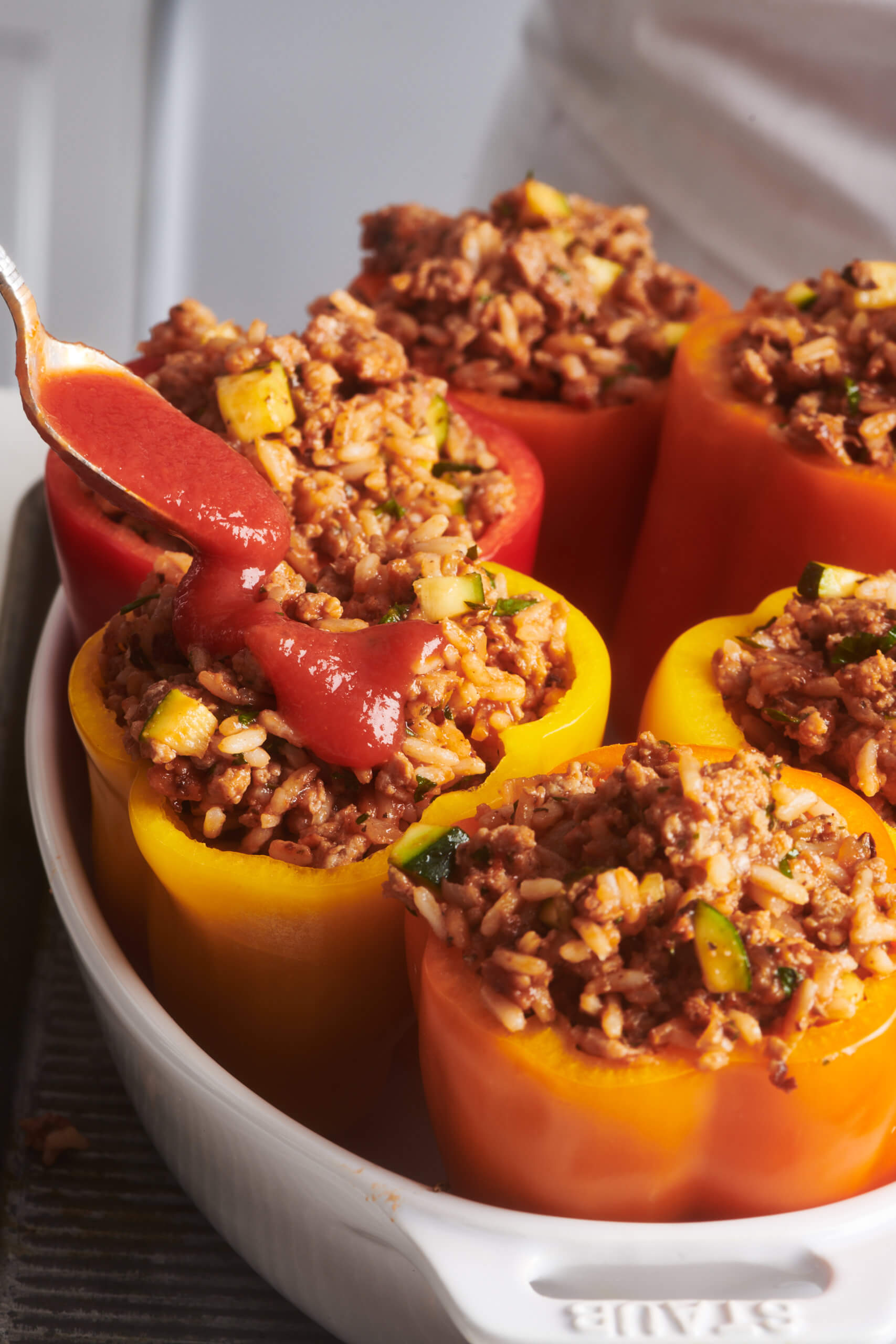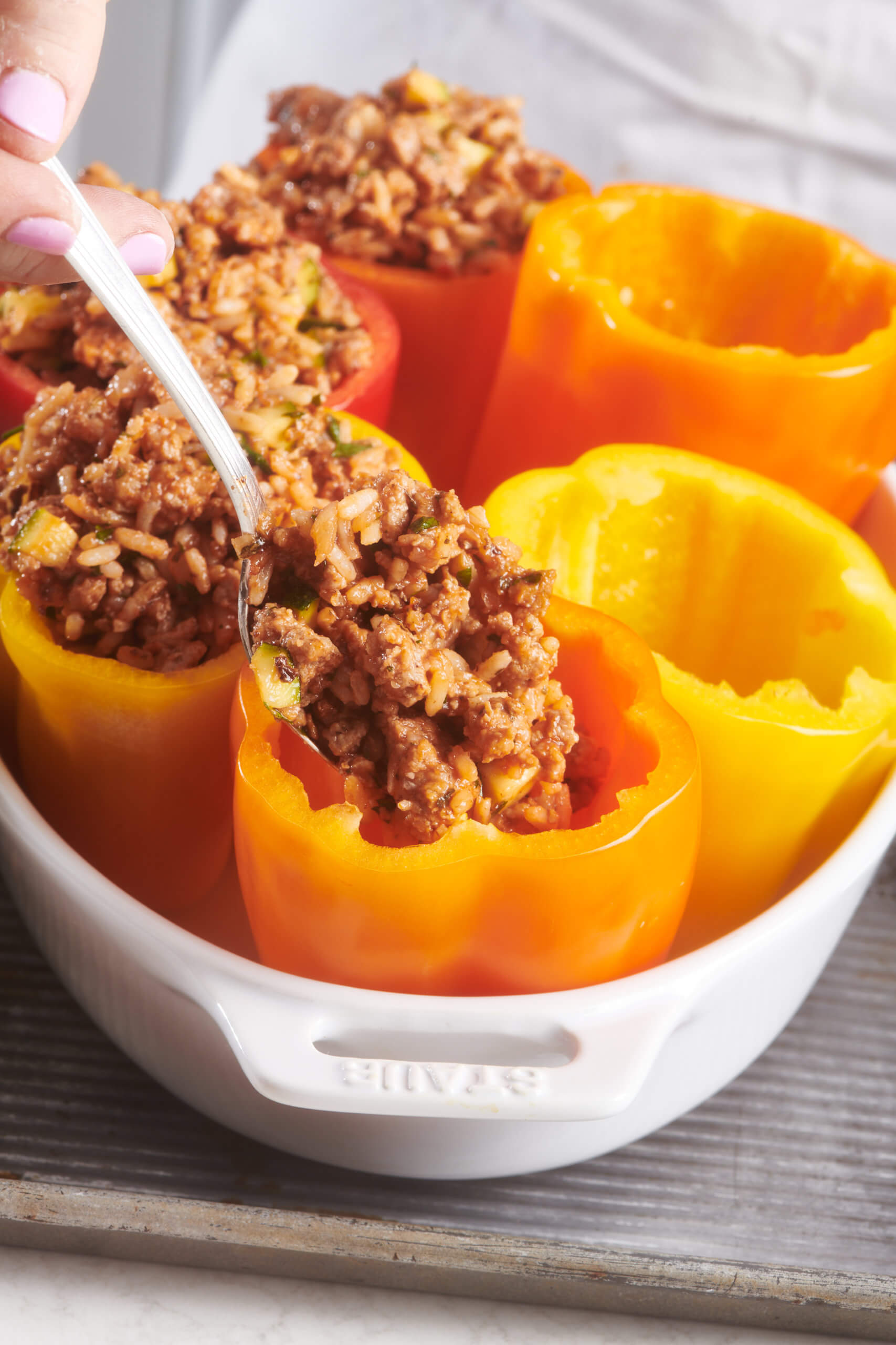 Don’t pack the stuffing too densely into the peppers; it will slow down the baking, and the core of the peppers might not get hot.