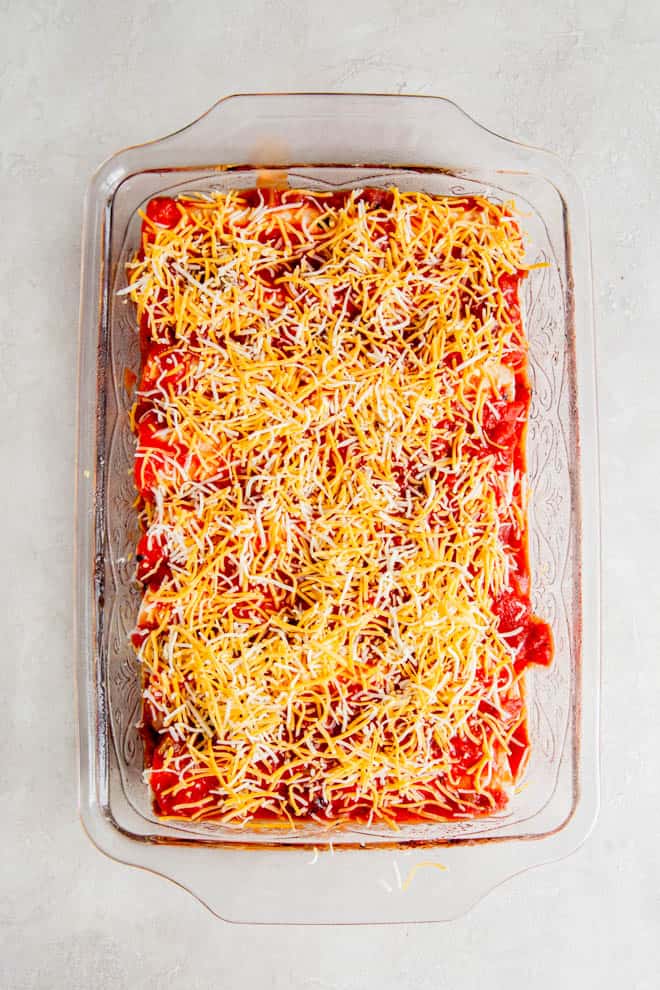 Top with remaining salsa mixture. Sprinkle with Cheddar cheese.