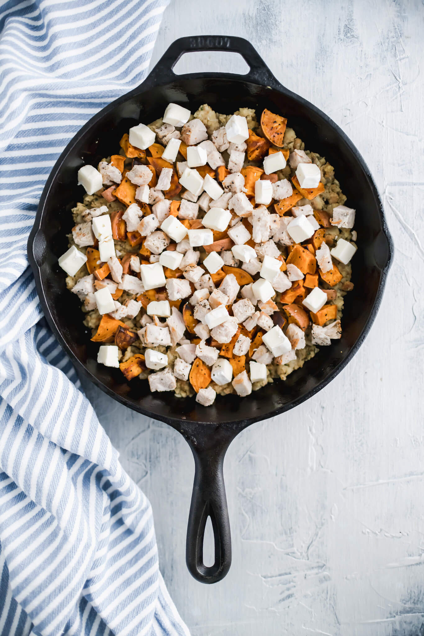 Preheat the oven to 425°F. Drizzle a 10-inch cast iron skillet with olive oil and brush to coat the bottom and sides. Press the stuffing into the bottom of the cast iron skillet. Top with sweet potatoes, turkey and cheese.