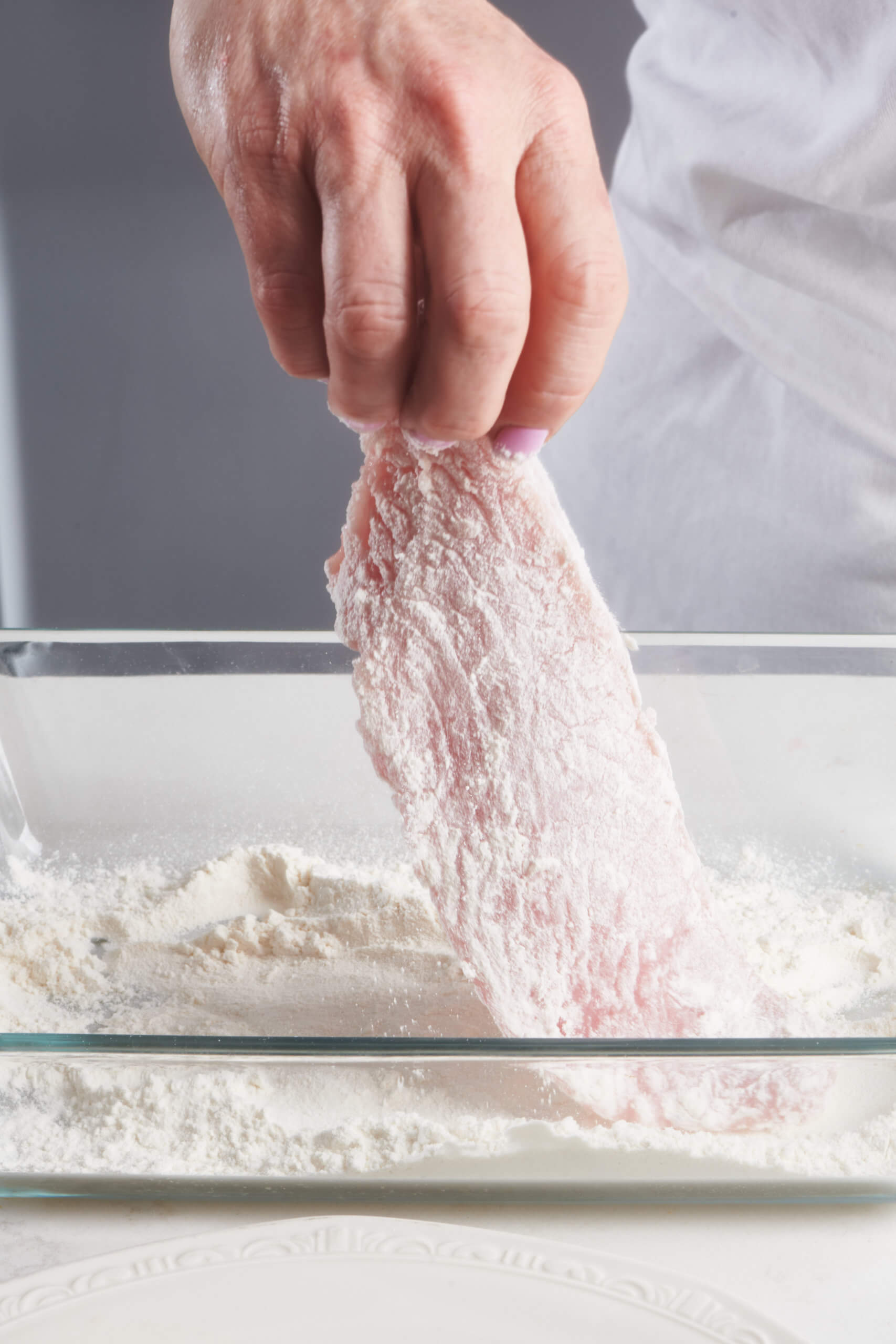 Heat the oil in a very large skillet over medium high heat. Dredge the cutlets in the flour mixture and when the oil is hot place them in the pan, making sure not to crowd them and cook for about 3 minutes, until the bottom is golden brown, then flip and cook for another 3 to 4 minutes, until the bottom is browned and the turkey is just cooked through. Remove the turkey from the pan to a platter.