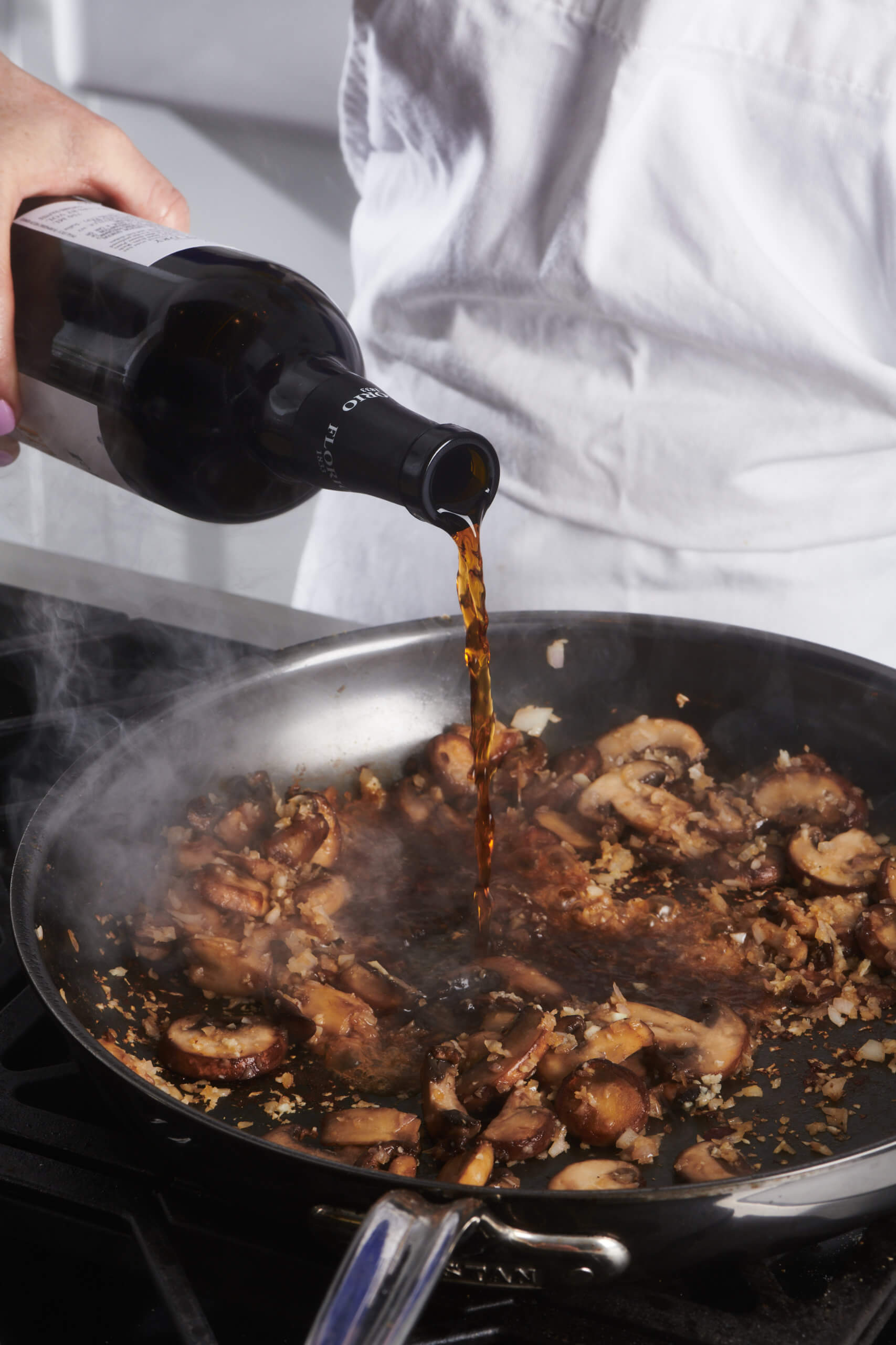Return the pan to medium high heat and add the mushrooms. Cook, stirring occasionally, scraping the bottom of the pan, until the mushrooms are browned and any liquid released by the mushrooms has evaporated. Add the shallots and garlic and stir for one more minute until you can smell the garlic.